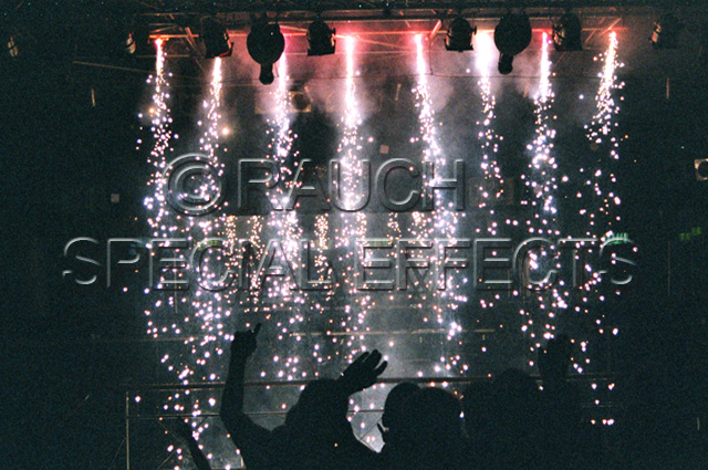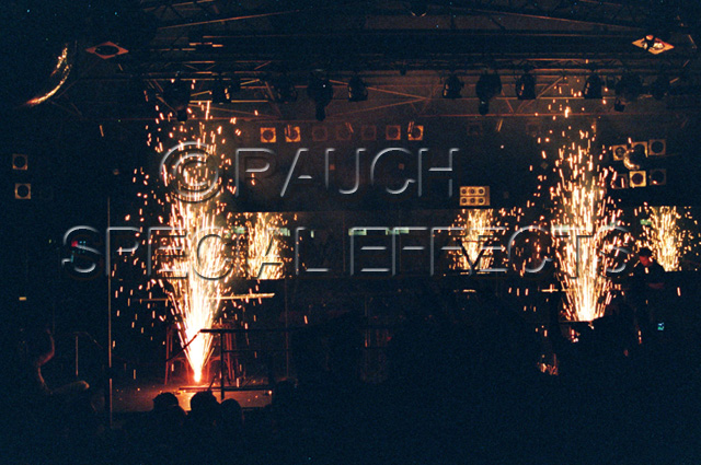 Flammensäulen, Bühnenfontänen, Bühnenwasserfälle, Bühnenblitze, Bühnenknallsätze, Bühneneffektwerfer, wie z.B. Konfetti, Schnee, Blättertanz, Silber- oder Goldglitter, Luftschlangen etc.
